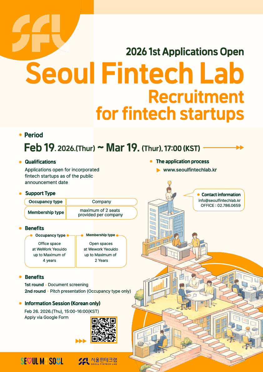 [Seoul Fintech Lab], created and operated by Seoul Metropolitan Government, is recruiting applicants to support the growth of fintech startups as follows, so please apply for many interested fintech companies.